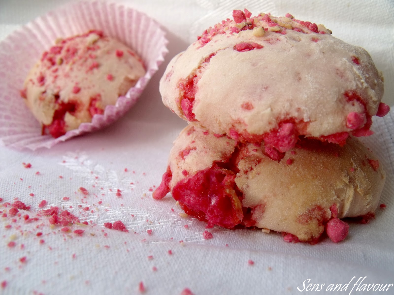 J'ai choisit d'ajouter quelques gouttes de colorant rouge, afin de rosir mes cookies. 3 gouttes de colorant n'apportent pas une couleur très soutenue. A vous de doser selon vos envie, j'ai préféré garder un rose très pâle, pour trancher avec les pralines concassées.